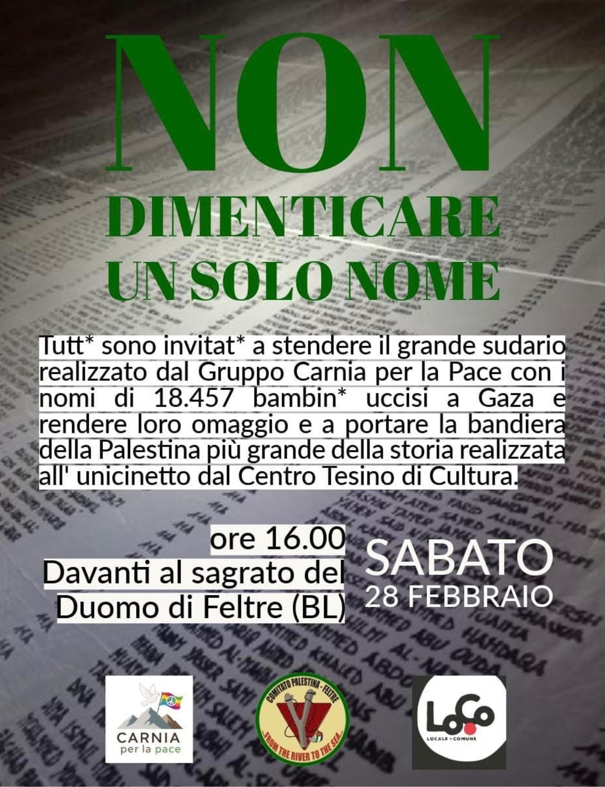 Stenderemo l' impressionante SUDARIO realizzato in Friuli dal Gruppo "Carnia per la Pace" ,✍️ con impresso le migliaia di nomi di bambini che sono stati strappati violentemente alla vita.
