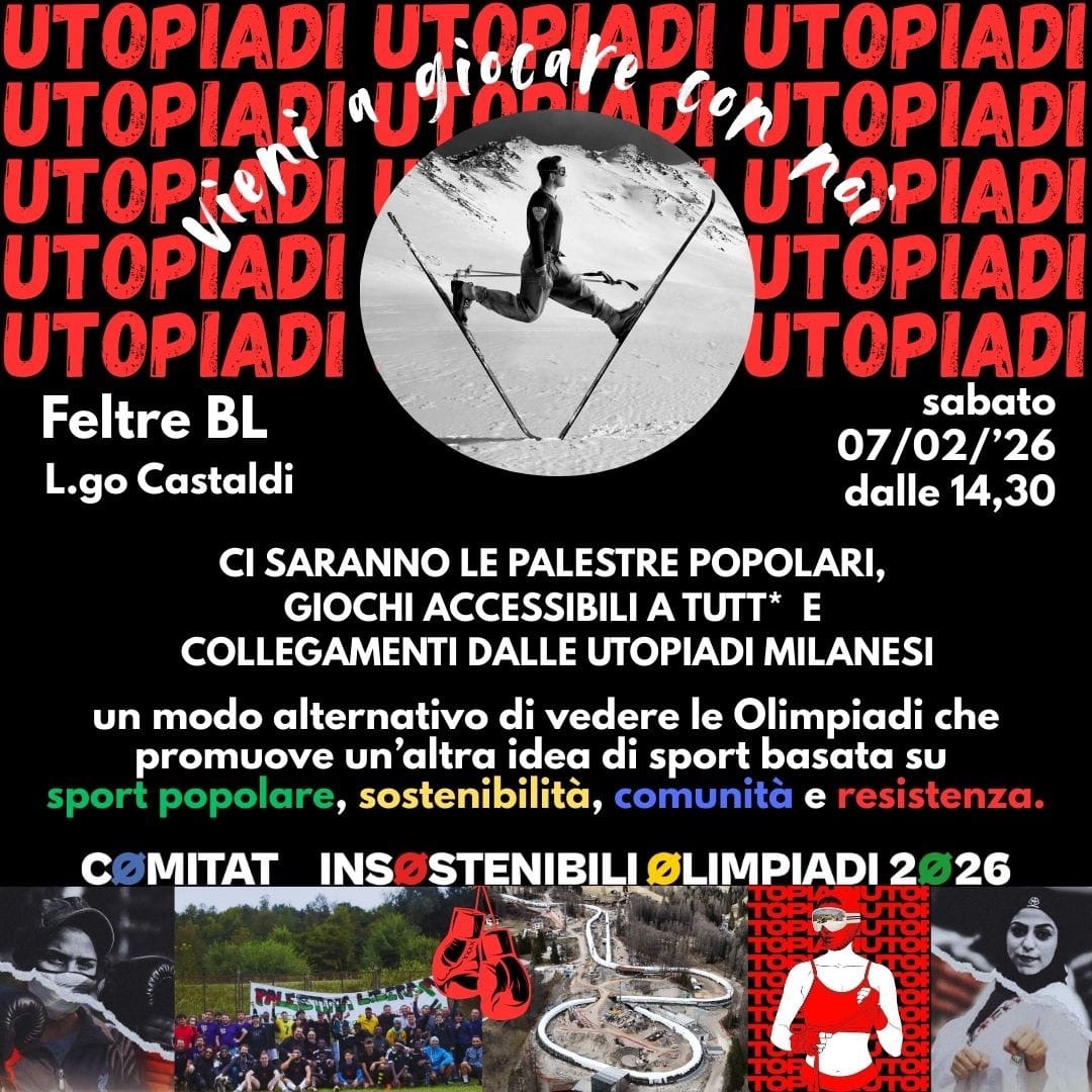 Il 7 febbraio, simultaneamente alle tre giornate di lotta, convergenza, mobilitazione e sport popolare che si svolgeranno a Milano in occasione dell’apertura delle Olimpiadi, anche a Feltre (come in molte altre città) condividiamo le UTOPIADI e organizziamo un pomeriggio di SOCIALITÀ E DI REALE SPIRITO OLIMPICO: fatto di sport popolare e pratiche collettive accessibili a tutt* e per ogni età.