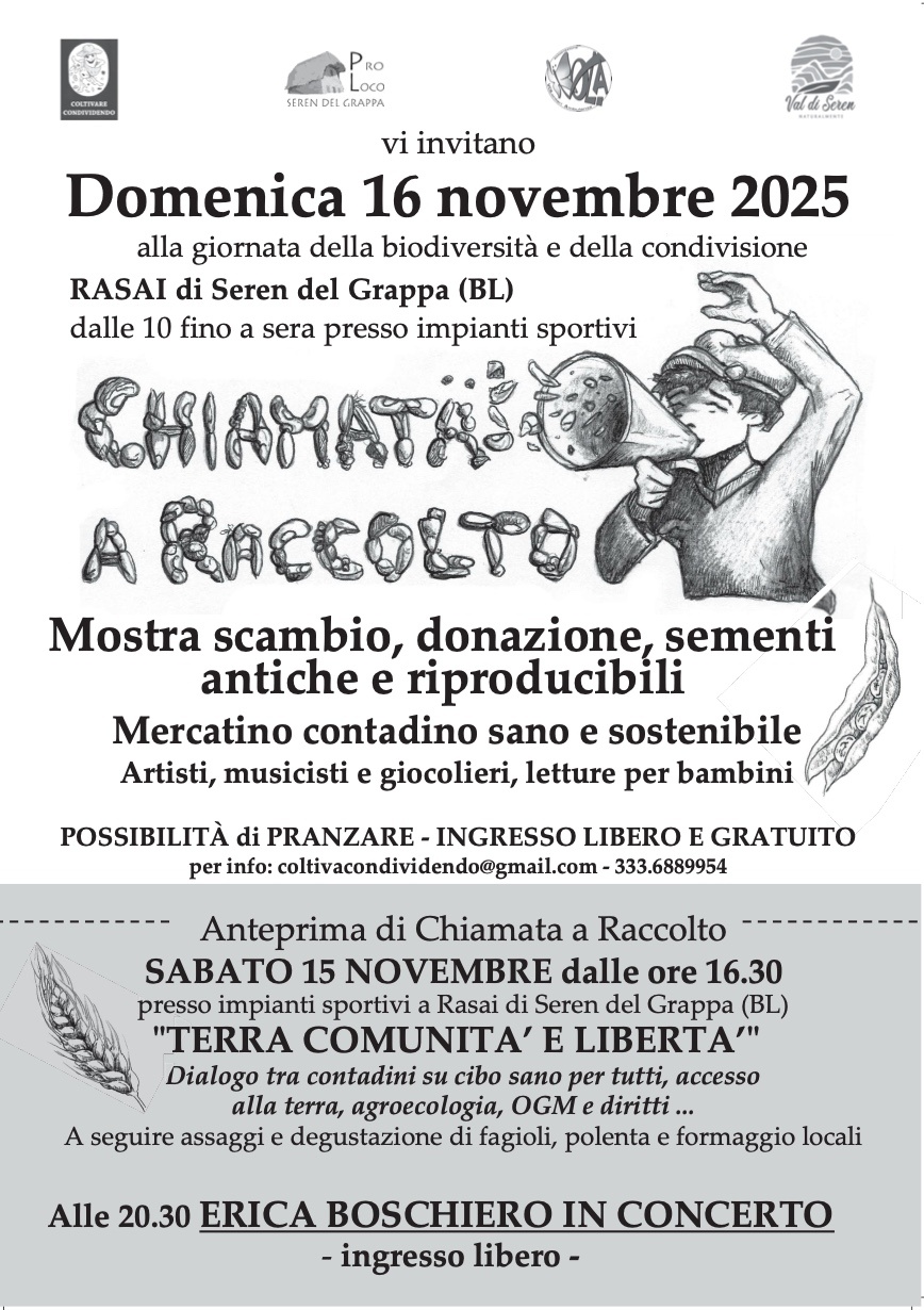 giornata di incontro di agricoltori per scambio di semi, piante, conoscenze, rivendicazioni... tutto fuori dal mercato e dalle logiche castrati della pecunia e del profitto... giornata di salvaguardia della biosfera e molto di più... concerto finale con la cantautrice Erica Boschiero... all'esterno mercatino e blablabla