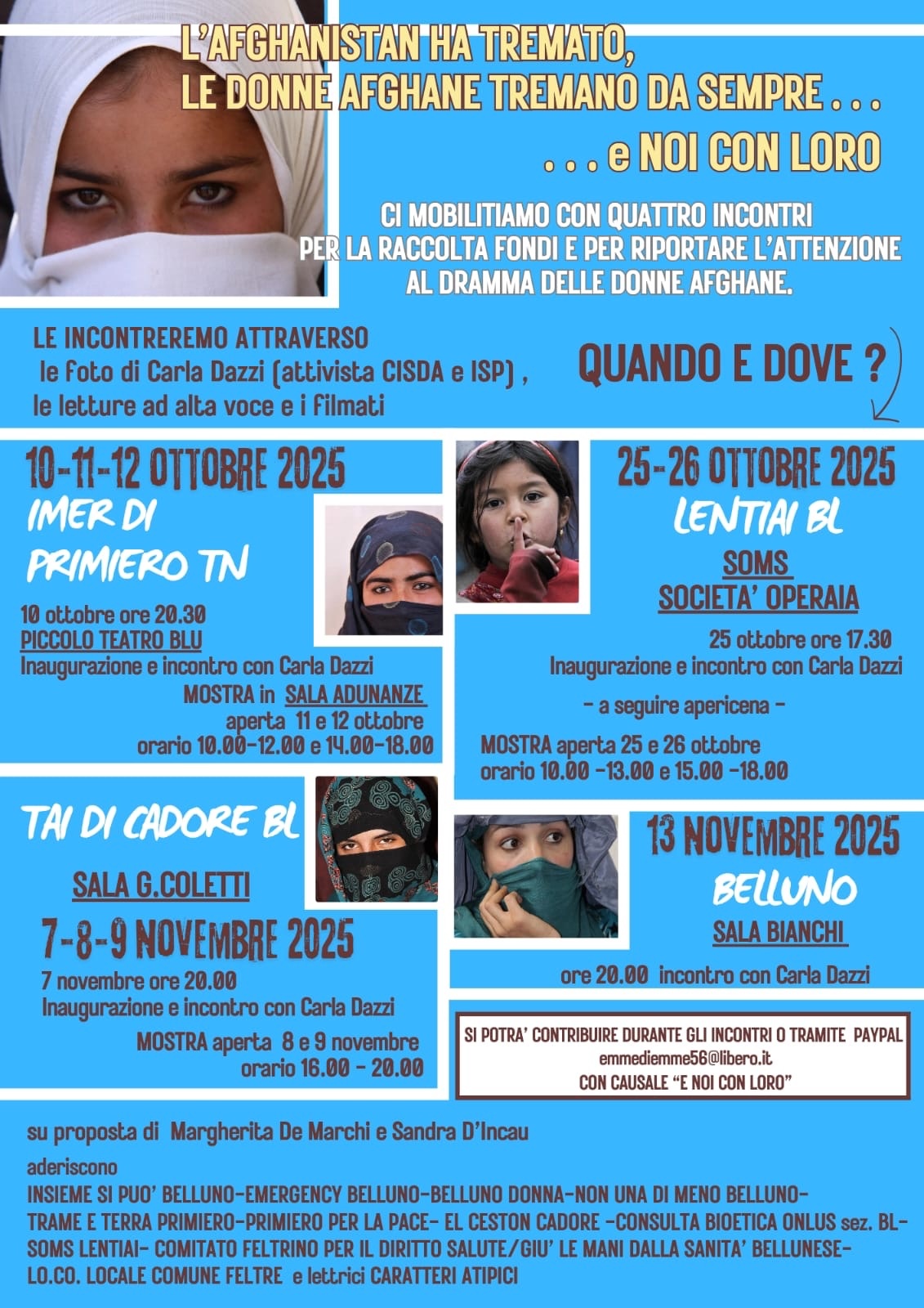 Ci mobilitiamo con quattro incontri per la raccolta fondi e per riportare l'attenzione al dramma delle donne afghane.