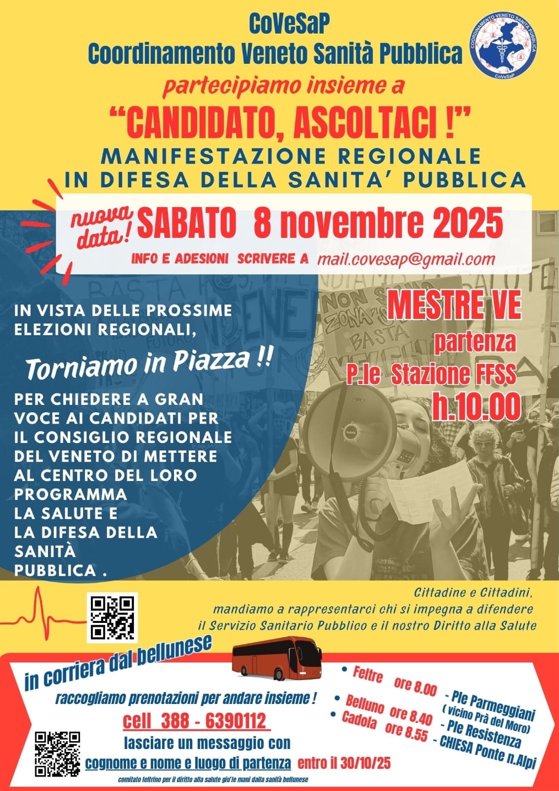 Manifestazione regionale in difesa della sanità pubblica. Corriera da Feltre, Belluno, Cadola