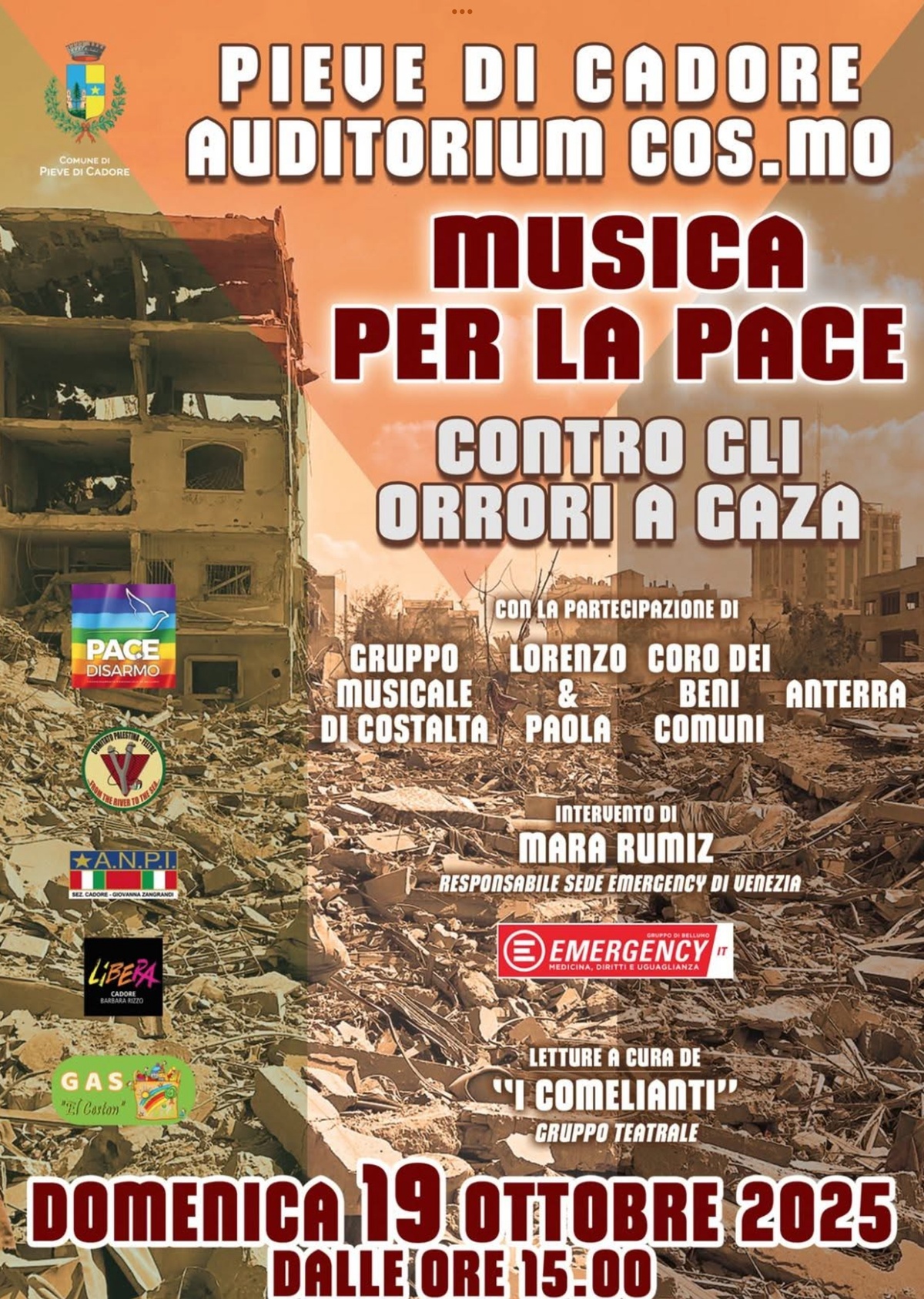 Il Comune di Pieve di Cadore promuove l’evento “Musica per la Pace – Contro gli orrori a Gaza”, un momento di condivisione e riflessione attraverso la musica, per tenere viva l’attenzione sul drammatico conflitto in Medio Oriente.