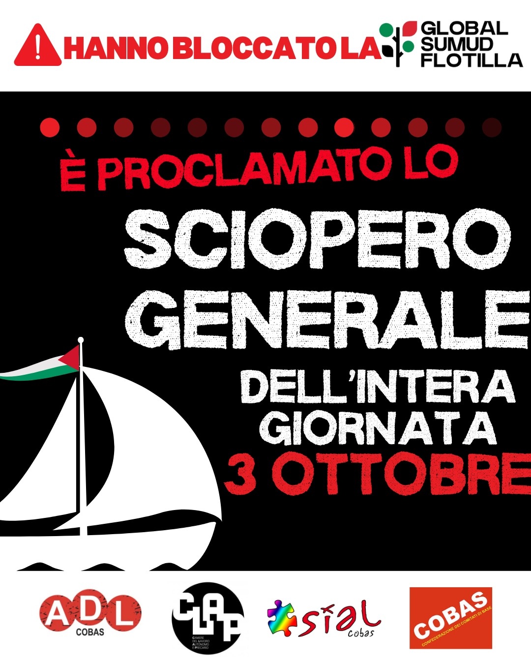 🔥 È il momento di reagire insieme: è stato appena proclamato lo sciopero generale dell'intera giornata per venerdì 3 ottobre. In ogni territorio, in ogni città, blocchiamo tutto!